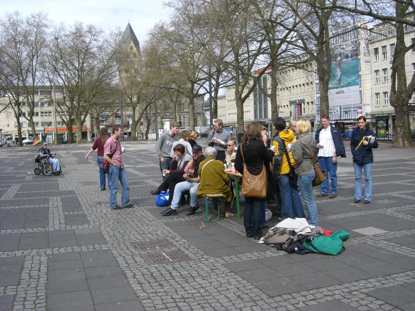 Hier beim öffentlichen Kaffeetrinken mit fremden Menschen. Eine von vielen Aktionen, organisiert durch die Teilnehmer, hier in Köln, zur Entwicklung von Sozialkompetenz und guter, offener und spontaner Kommunikation.